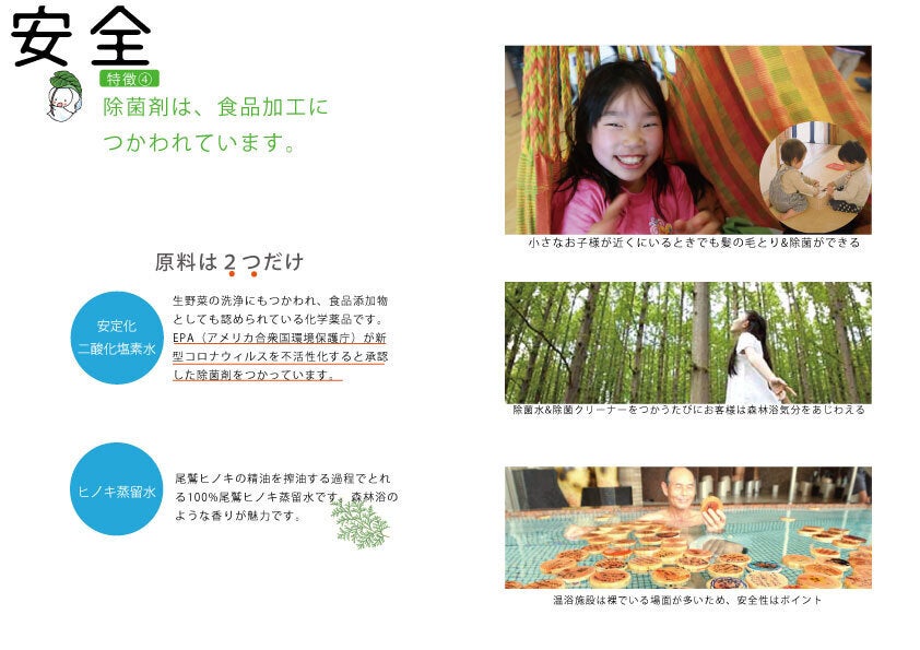 ヒノキスプラスはノンアルコールなので素材を傷めにくく、皮膚刺激性も見られないので手指の消毒にも安心してお使いいただけます。また吹きかけてから徐々に効果を発揮する特徴があり、除菌作用が長く持続します。