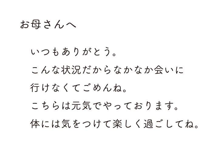 あれから一年が経ちました。状況は好転することなく、むしろ悪化しています。今、このタイミングだからこそ、しばらく会えていないあの人を想う。近くにいる家族を想う。遠く離れた家族を想う。友人を想う。恋人を想う。