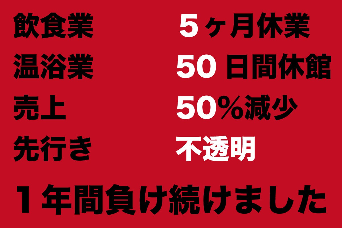 こうして、15年に渡り「地域の資源で社会問題を克服する仕組みづくり」と「まちが本来持っている強さや、ならではを大事にする商品/サービスの開発」を行なってきましたが、新型コロナウイルスの影響で昨年2月末頃から、長期の休業を余儀なくされ、全国各地の温浴施設で行われる予定であったイベントのキャンセルも相次ぎ、今期の売上も約50%を失う結果となってしまいました。とどまることのない新型コロナウイルスの影響によって、今後の見通しがつかない状態です。