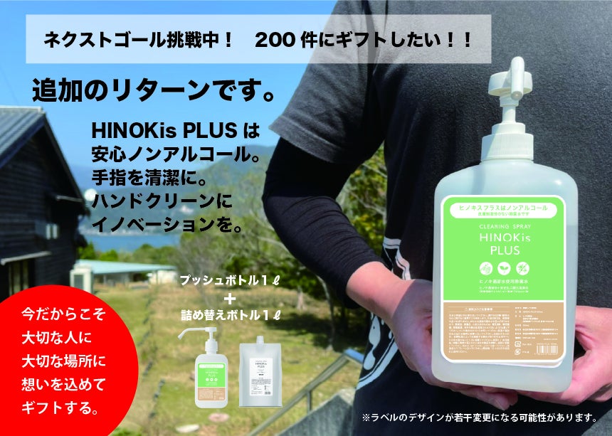 みなさんのおかげで100%達成いたしました。200人の方の大切な200人にヒノキスプラスがギフトされることが何より嬉しいです!