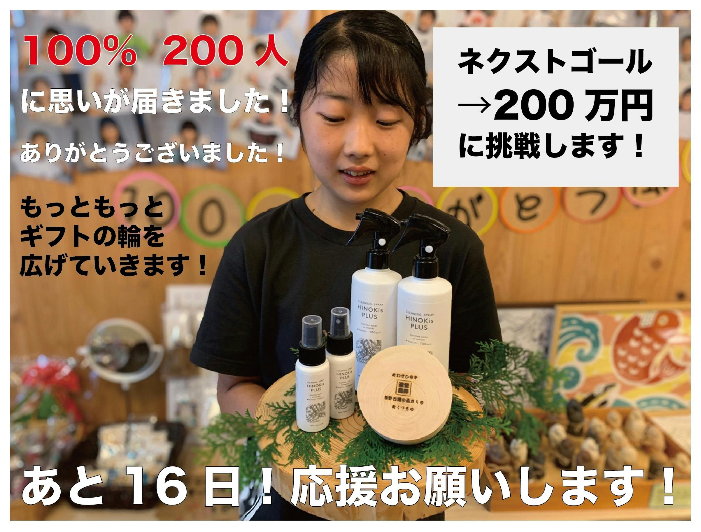 ネクストゴールでは200万円を目指します。あと残り16日、「誰かを思う瞬間」「大切な人にHINOKis PLUSをギフトする」という行為を増やしていきたいです。
