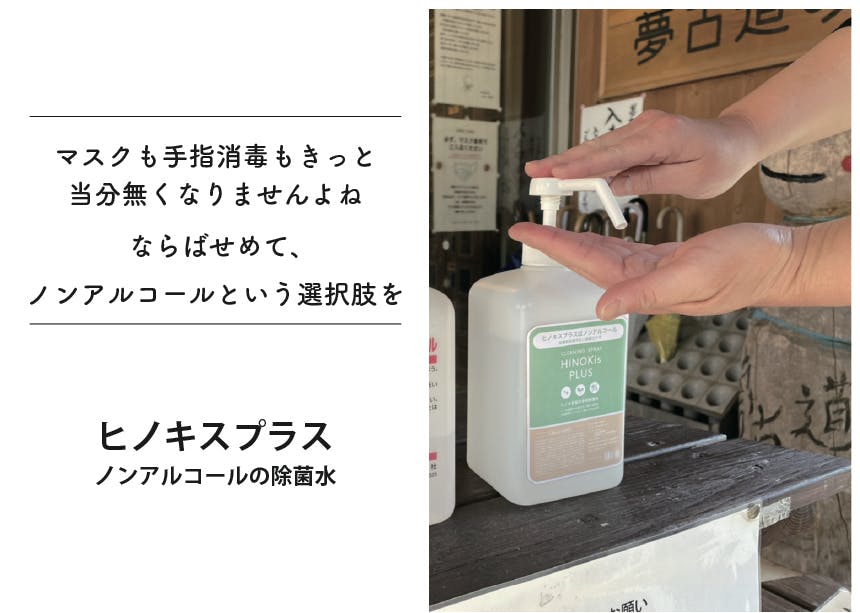 お店に入る時の手指の除菌が、アルコールかノンアルコール、どちらかを選べたらいいよね、という思いでヒノキスプラスの店頭用ボトルポンプを作りました。ノンアルコールという選択肢を提案したい。