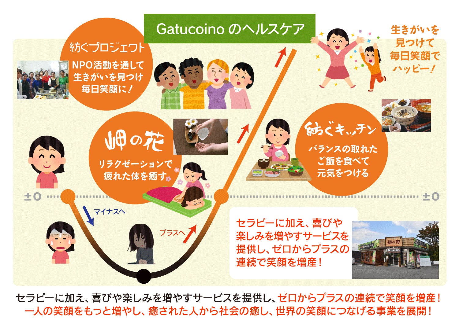 富山県富山市にある合同会社Gatucoinoでは「人と社会に笑顔と癒しの増産」をテーマに、カラダを癒す『セラピー部門』、安心・健康ごはんでカラダの中から癒す『飲食部門』、日本とミャンマーの国際協力として現地の子供たちや小さな村に店内で集めた支援物資をプレゼントとして贈るNPO活動などをしております。