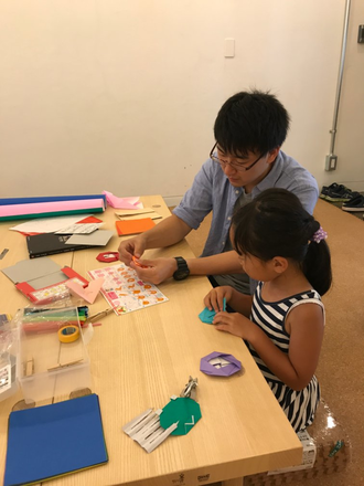 プレオープンにもお客さんが来てくれています。今日はフリータイム、という名前で「好きな時間にきて好きなだけ遊んでいいよ」という時間を設けています。今回は折り紙のメンターが一日常駐しており、折り紙についてなら何でも聞ける日! もちろん折り紙以外の教室内の展示物で遊んでもOKです。