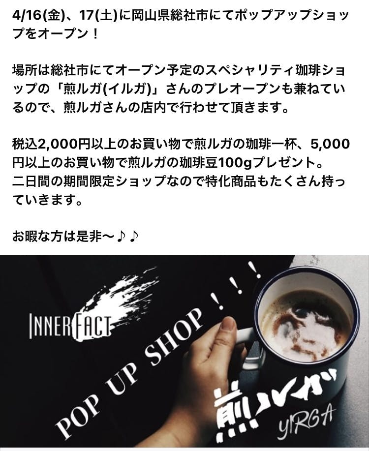 インナーファクト&UGLOWの商品をお買い上げいただいたら煎ルガのコーヒー豆やコーヒー一杯プレゼント!