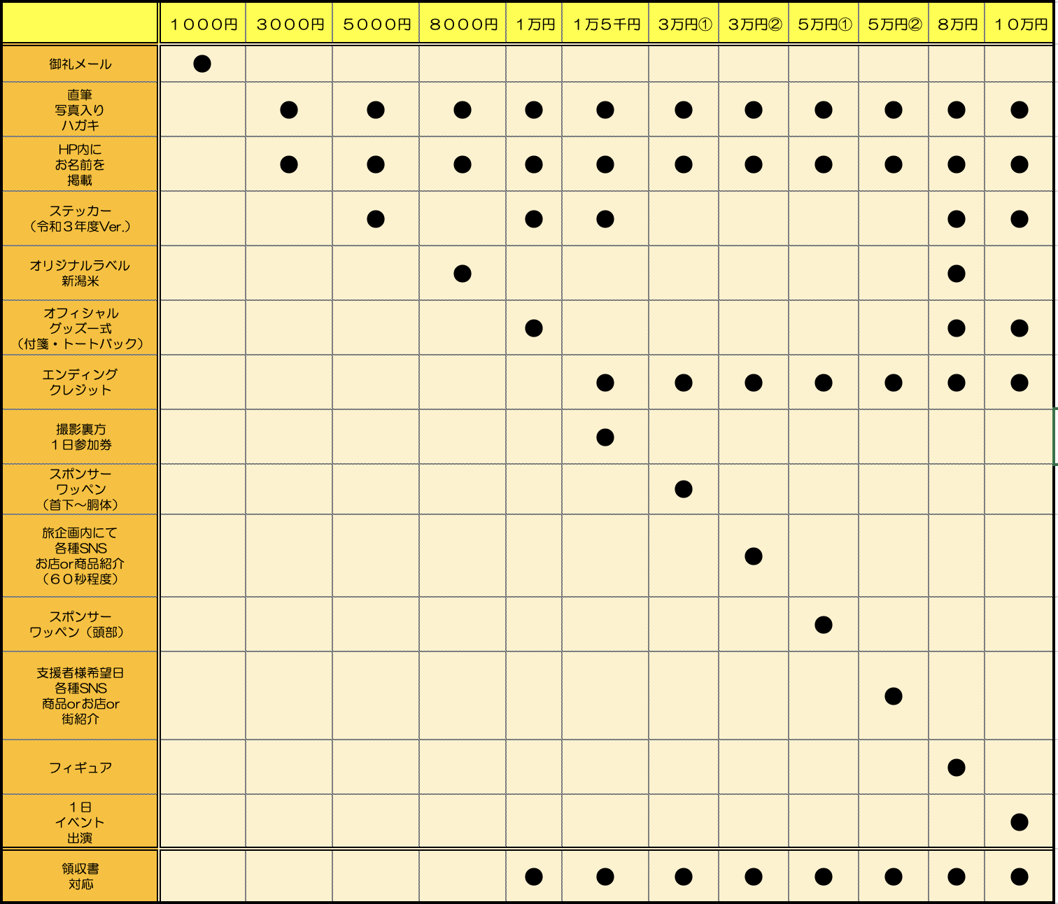 2022/02/05 10:08いつもお世話になっております。関西から新潟県をPR!!新潟県PRキャラクター(非公認)ニイガタ姉さんです。この度令和4年度ニイガタ姉さんサポーターを募集させていただきます。募集期間は、令和4年2月5日土曜日〜3月26日土曜日までです。お申し込みは、こちらからとなっております。https://niigataneesan.stores.jp2021年7月からスタートした新潟県30市町村完全制覇の旅当初は、原付バイクで新潟県内を周遊しておりました。度重なる緊急事態宣言で当初春〜秋で終わるはずが延期延期で12月までかかりました。粟島先生には2回振られてしまったので(告白してないのに、振られる感じっすねwえ〜><!!!!!不完全燃焼みたいな(笑))粟島は来年度の7月14〜15日に訪問します。(本気)この旅に行くと、本当にいろんな方との出会いがあります。(写真はほんとに一部です)そして、感じることは「新潟県ってなんにもないところでしょう?」と多くの新潟県民の方がおっしゃるのですがTwitterで募集するとおすすめの場所が出てくる出てくる!!!!!「新潟県いっぱいおすすめの場所あるじゃないですか!!!!!!!!!」これがこの1年の感想です(笑)嬉しい。そして・・・新潟県奥が深すぎる。年始に2周目行くか悩んでいた時にツイッター・インスタグラムで「2周目行った方がいいですか?」という質問に500名以上の方が「行った方がいい!!」にぽちっとしてくださいました。これは行くしかありませんね。(交通手段は悩み中)1周目は王道のところしか回れていないので2周目ではさらにパワーアップして新潟県内を回ると色々と発掘できたり、情報発信をしていきたいです。私にしかできないことをどんどんやっていきたい。ということで、いただいた資金は新潟県30市町村完全制覇の旅2周目の旅費に活用させていただきます。内容といたしましては、1周目に行っていない場所・サポーターさんのお店などを中心に回ろうと思っております。また、キッチンカーで新潟県内を1回だけ回ります。(これはスペシャル企画枠っていう感じでやろうかな。)..1000円のコースから今回は以前よりもリターンのグッズの内容がバージョンアップしております。今年度のスポンサーワッペン等の掲載は、令和4年3月31日まで4月1日より新年度のものに更新となります。ご検討のほど、よろしくお願いいたします。請求書払いも可能でございます。請求書ご希望の方は、こちらよりお進みください。→https://ssl.form-mailer.jp/fms/4d82fc11694183なお、2年目・3年目の継続の方には、専用のおまけが今回もご用意しております。(新バージョンです。) もっと見る令和4年度ニイガタ姉さん応援サポーター募集の件について