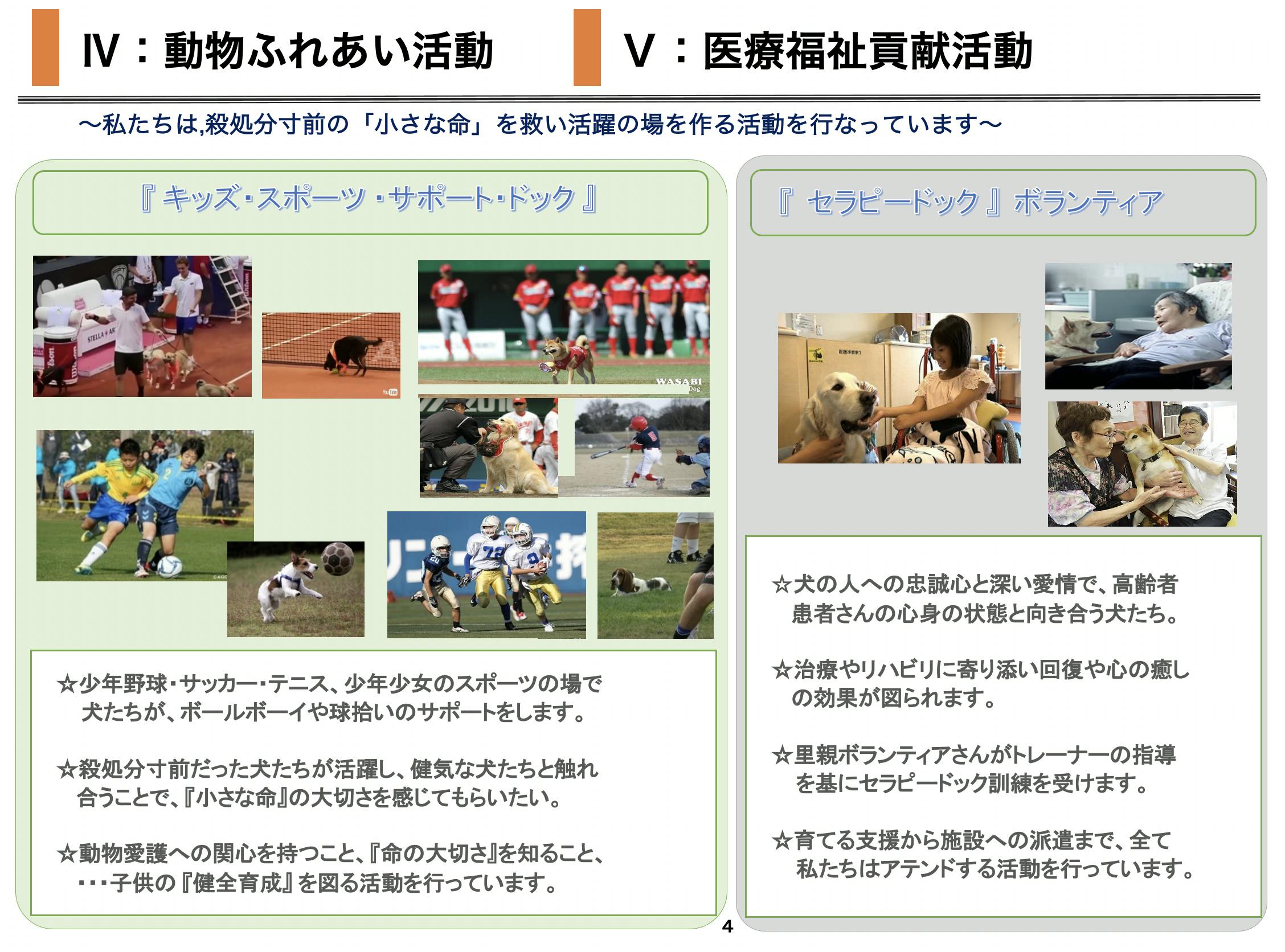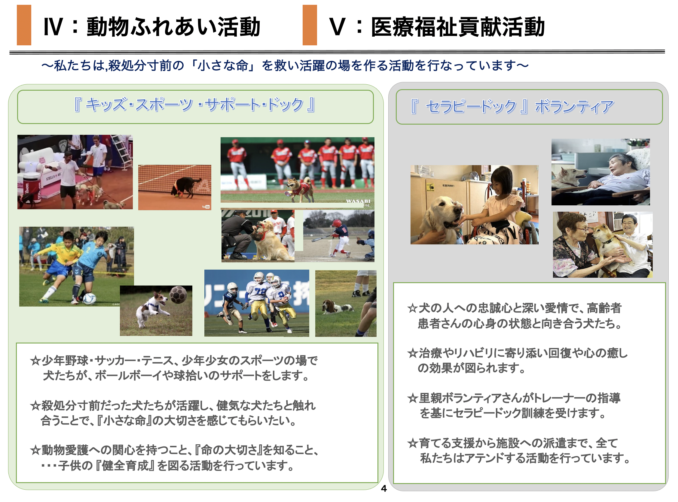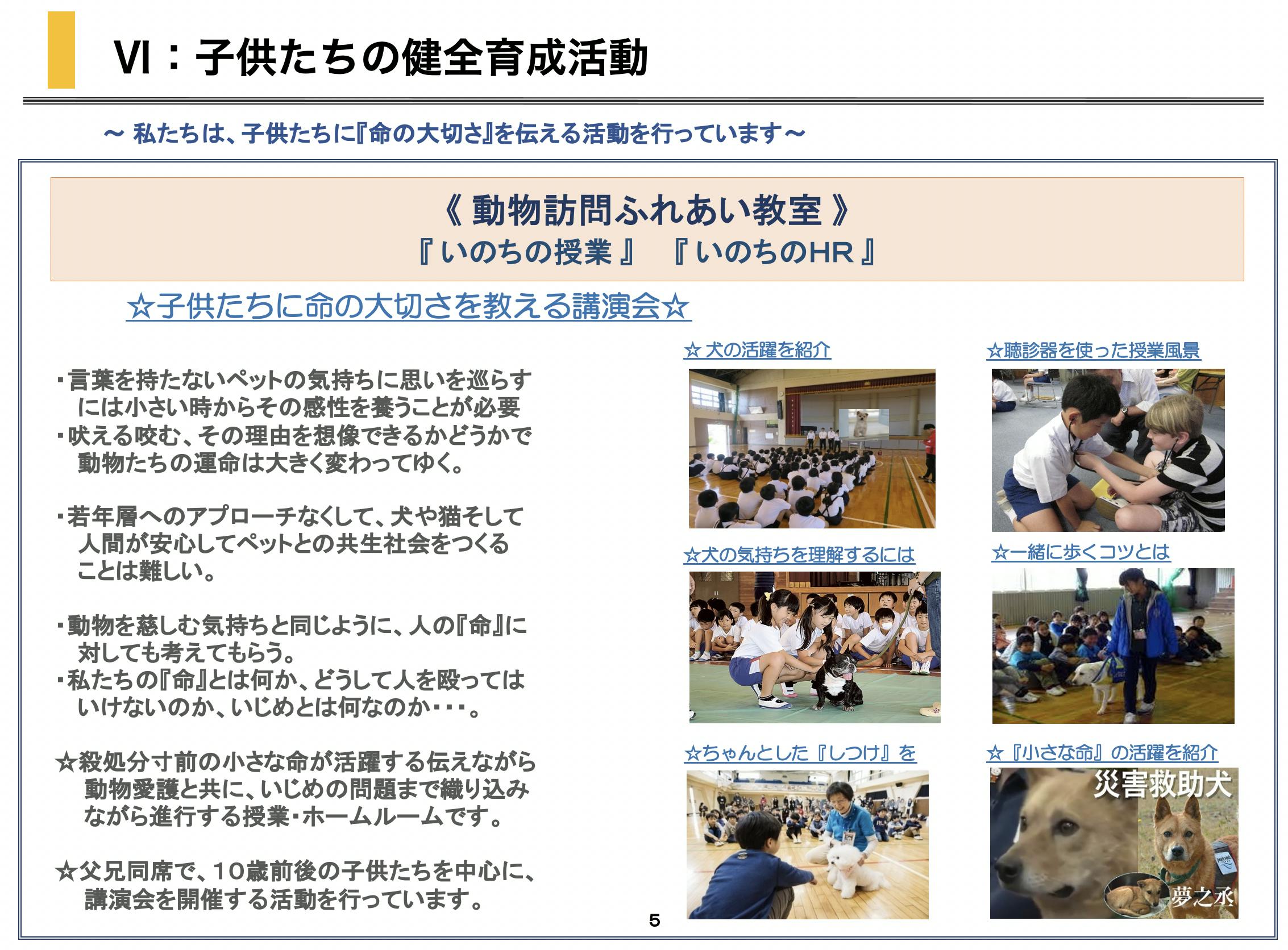 1:殺処分寸前の犬や猫たちが子供たちのために活躍する場をつくる活動を行っています。2:活躍する犬や猫たちの活動を通して子供たちに『命の大切さ』を伝える「講演会活動」