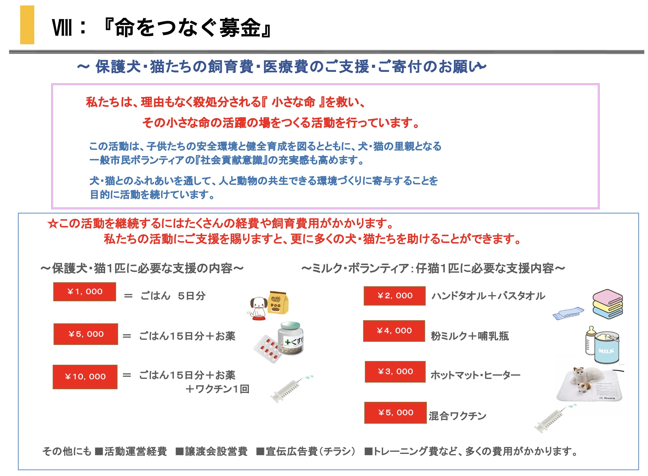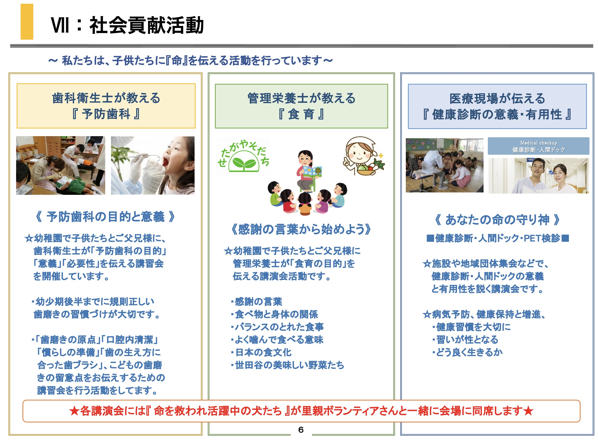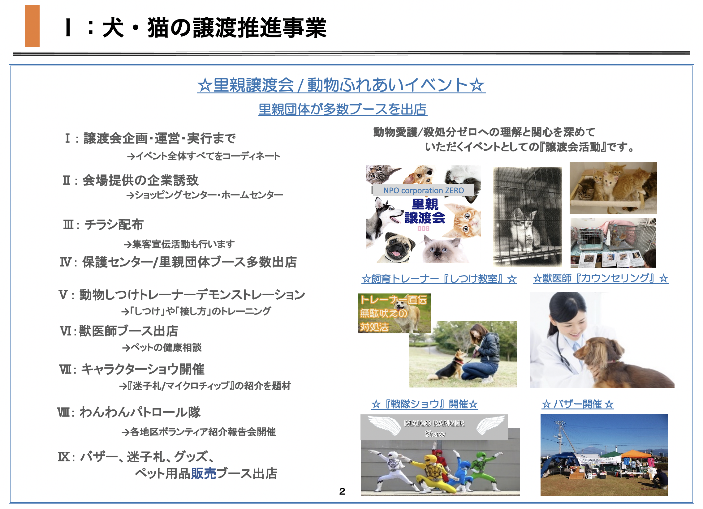 1:殺処分寸前の犬や猫たちが子供たちのために活躍する場をつくる活動を行っています。2:活躍する犬や猫たちの活動を通して子供たちに『命の大切さ』を伝える「講演会活動」
