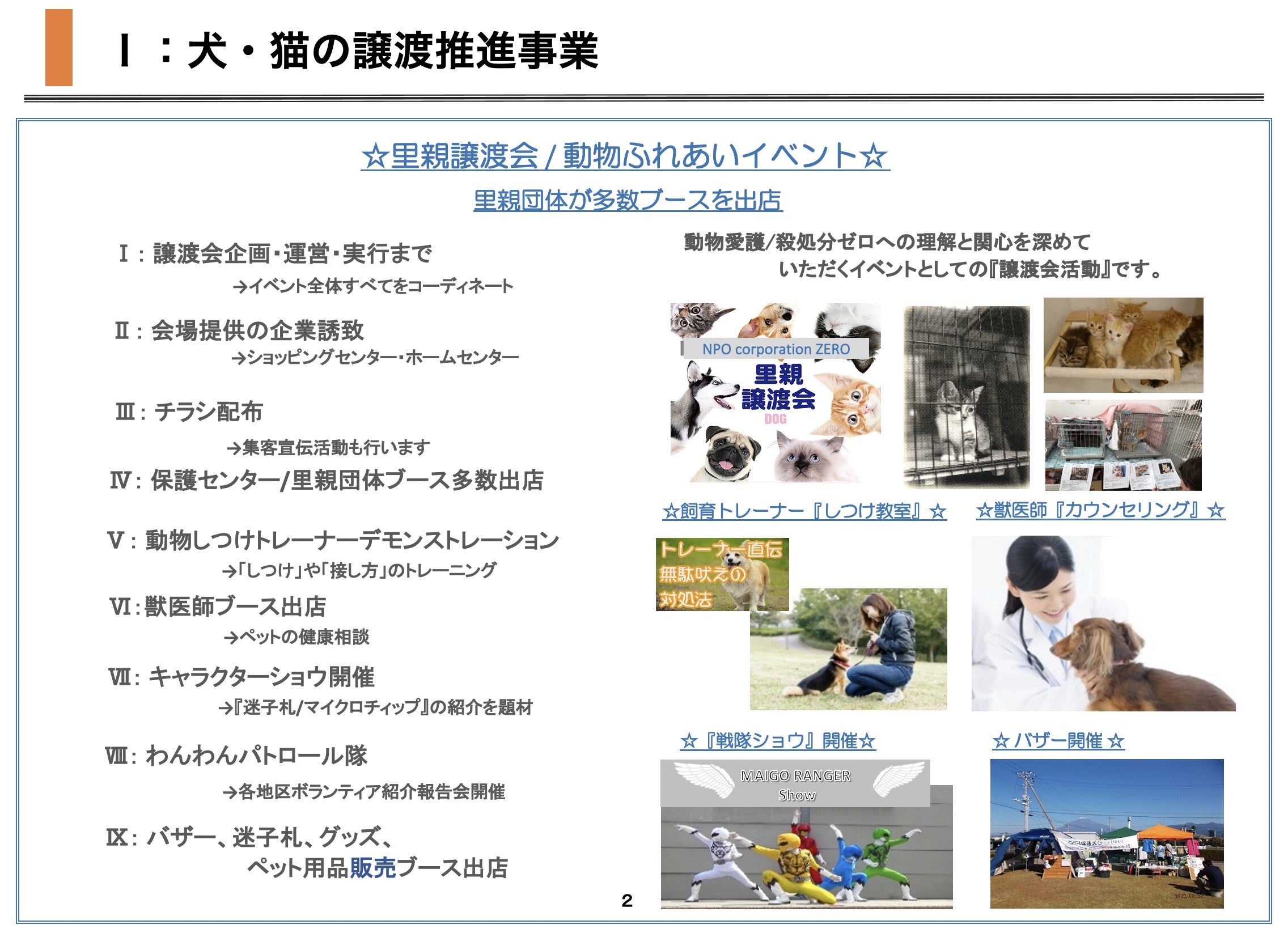 ・令和2年 6月21日:「特定非営利活動法人ZERO」設立総会開催 ・令和2年10月12日: 同法人 設立認証 完了 ・令和2年12月~ : 「譲渡会」開催準備のため保護団体へ参加依頼を開始する ・令和2年12月~:「譲渡会会場」となるホームセンター、ショッピングセンターへ