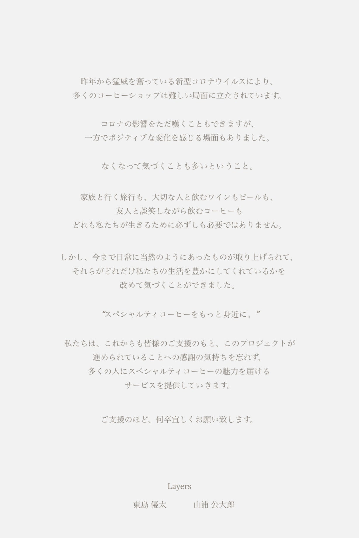 2022/02/03 11:00こんにちは。Layersの東島です。本プロジェクトを応援していただき、誠にありがとうございます!さて、第6回のリターンにつきましては、2月1日に発送しております。早ければすでにご自宅に届いているかと思います!プランによって異なりますが、これまで6回にわたり日本各地のロースターが焙煎するコーヒー豆をお送りしてきました。これをもちまして、全てのリターンの発送が完了しました。思い返せば、毎月今回はどんなコーヒー豆がロースターさんから送られてくるのか、とても楽しみにしている自分がいました。運営者でありながら、このサービスのファンです!この定期便のサービスで、自分のお気に入りのコーヒー豆やロースターを見つけられたり、コーヒーに少しでも興味が湧いたり、、、そんな体験をお届けできていれば幸いです。これにて、このクラウドファンディングは終了となりますが、Bean to youのサービスは続いていきます。現在、Bean to youのサイトは新しい形にリニューアル中ですが、もっとパワーアップしたサイトを皆さんにお披露目できるよう準備を進めて参ります!改めまして、この度は本プロジェクトを応援していただき、誠にありがとうございました!それでは、コーヒーライフをお楽しみください!さあ、コーヒーの旅に出よう。ーーー"スペシャルティコーヒーをもっと身近に。"SNS等もやっているので、ぜひ覗いてみてください!Instagram(Bean to you) : https://www.instagram.com/beantoyou_layers/Instagram(Layers coffee) : https://www.instagram.com/layers.coffee/コーヒー定期便サイト : https://layers-coffee.myshopify.com/Twitter : https://twitter.com/bean_to_you もっと見る