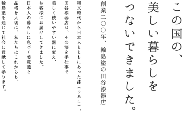 1818年創業の輪島塗の製造販売メーカー田谷漆器店。輪島塗の技法を忠実に守りながらも、新しい漆器の可能性を求めて様々なことに挑戦。建築内装への漆塗装や、海外マーケットに向けて現地のライフスタイルにあった商品の展開を行う。日本の一般顧客向けには、飽きのこない伝統的なオーソドックスな商品を作る。現在は、8代目田谷勤、9代目田谷昭宏、10代目田谷昂大の3世代が同時に働いており、その他10名の職人や従業員とともに、輪島の地で輪島塗製作を行う。