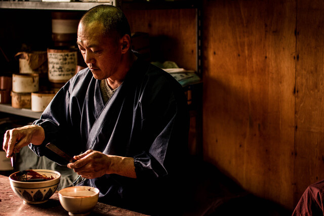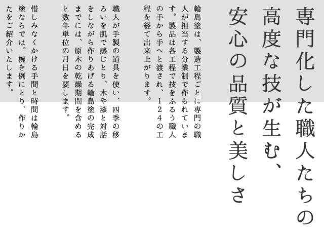 木を乾かすところから始めると、ひとつの飯椀を作るのにおよそ2年の月日がかかります。塗りの工程だけで5ヶ月から6ヶ月かかり、「木地師(きじし)」・「塗師(ぬりし)」・「研ぎ師(とぎし)」とそれぞれの職人が、124もの工程を経てひとつの飯椀が作られます。