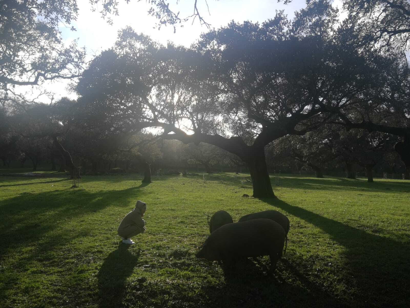 イベリコ豚は純血100%「ベジョータ」は貴重なイベリコ豚全体の中でも約7%しか存在しておりません。ベジョータの定義は、イベリコ豚の血統が50%以上。そしてどんぐりの実が落ちる時期に放牧し、秋から冬にかけドングリを食べて育っていることです。飼育日数も鹿児島黒豚の約3倍(約16ヶ月)と長く育てられているのもひとつです 1ベジョータは大自然の中自由に歩き回りどんぐりを探します。近くで見ると大きいです( ゚Д゚)