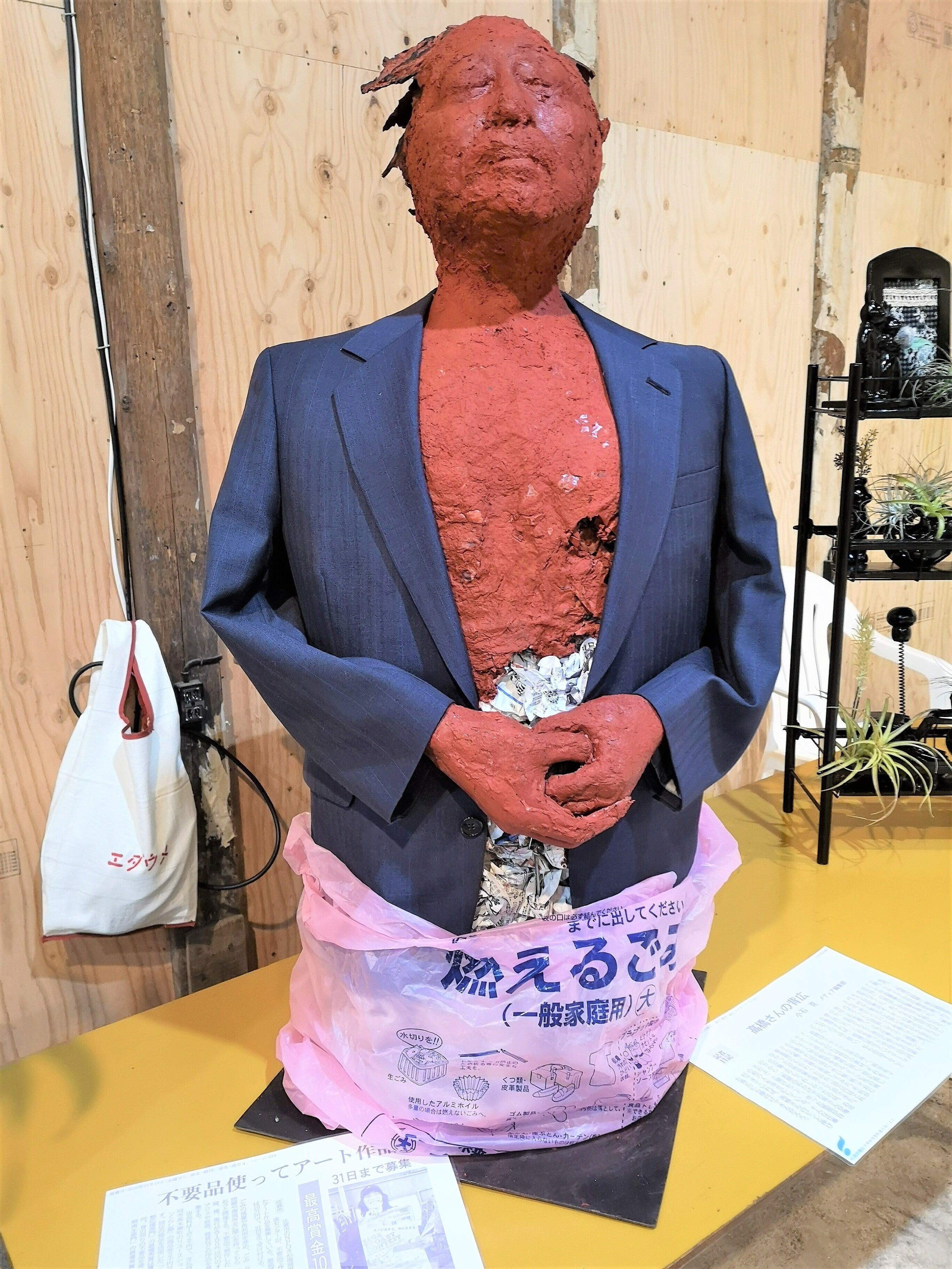 新聞紙を溶かして像を作り古いジャケットで着飾らせたり