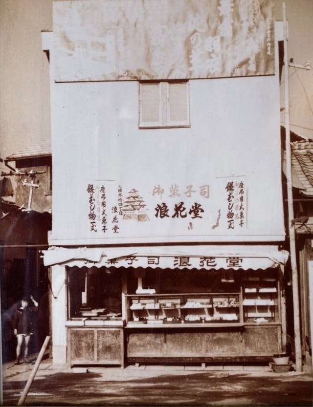 浪花堂は大阪の豊中の地で戦後間もない昭和29年に創業しました。製菓の材料不足の為、たくさんの和菓子を横広に並べることはなく、自家製の和菓子はお店中央にまとめて並べていました。