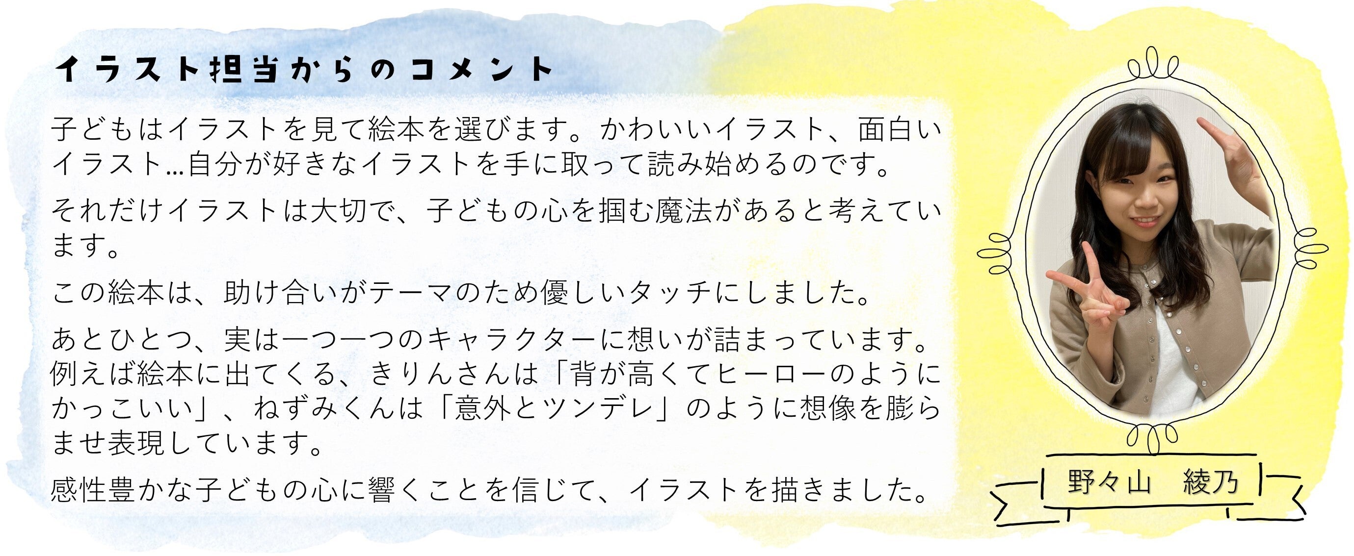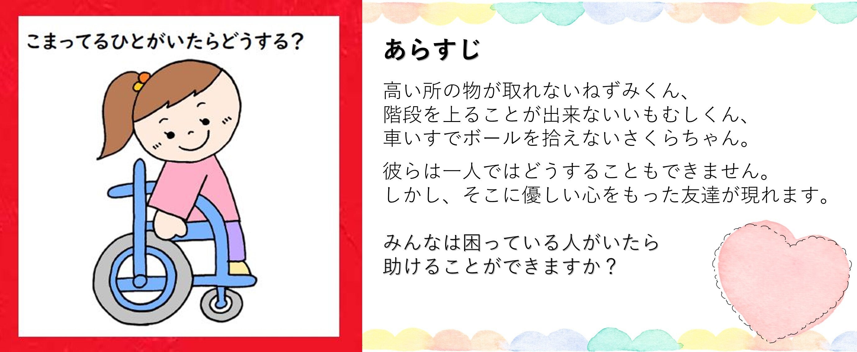 私たちは、楽しみながら、困っている人に対する理解を深めてほしい・学んでほしいという願いを込めて子どもに向けた絵本を作成しました。