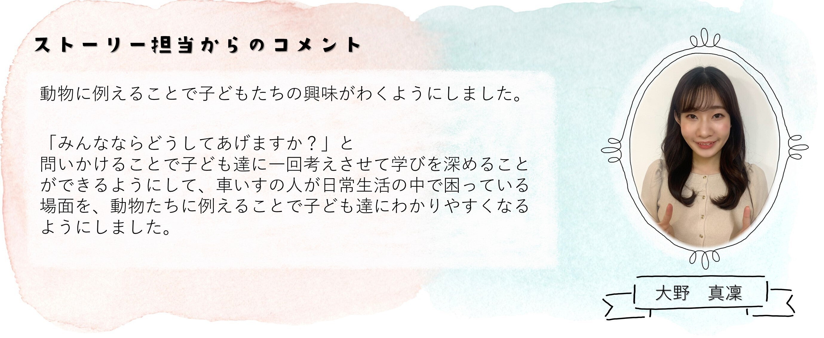 私たちは、楽しみながら、困っている人に対する理解を深めてほしい・学んでほしいという願いを込めて子どもに向けた絵本を作成しました。
