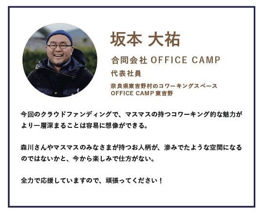 今回のクラウドファンディングで、マスマスの持つコワーキング的な魅力がより一層深まることは容易に想像ができる。