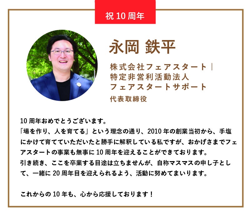 「場を作り、人を育てる」という理念の通り、2010年の創業当初から、手塩にかけて育てていただいたと勝手に解釈している私ですが、おかげさまでフェアスタートの事業も無事に10周年を迎えることができております。