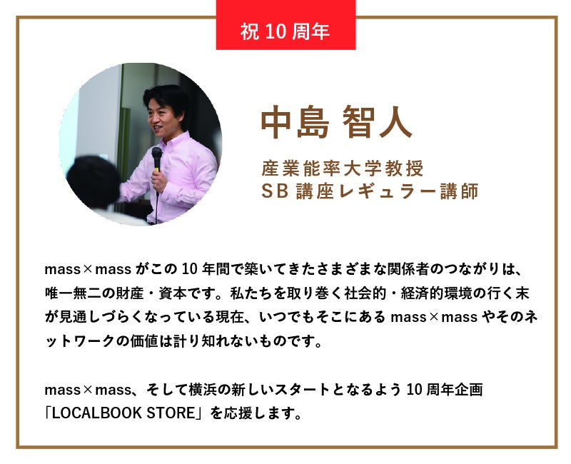 マスマスはシェアオフィス&コワーキングスペースという働く場だけでなく、さまざまなスクール事業も行われています。その中でも2014年から横浜市経済局の委託を受けながら、継続的にソーシャルビジネスの起業家を育成するスクールで数多くの方々に“学び”の場としても、ご活用いただいてきました。その【ソーシャルビジネススタートアップ講座】でアカデミックな視点から、社会的企業・ソーシャルインパクトなど、数多くの講座を担っていただいた中島先生からも応援メッセージを頂戴しました!中島先生、本当にありがとうございます!===============mass×massがこの10年間で築いてきたさまざまな関係者のつながりは、唯一無二の財産・資本です。私たちを取り巻く社会的・経済的環境の行く末が見通しづらくなっている現在、いつでもそこにあるmass×massやそのネットワークの価値は計り知れないものです。mass×mass、そして横浜の新しいスタートとなるよう10周年企画「LOCAL BOOK STORE」を応援します。