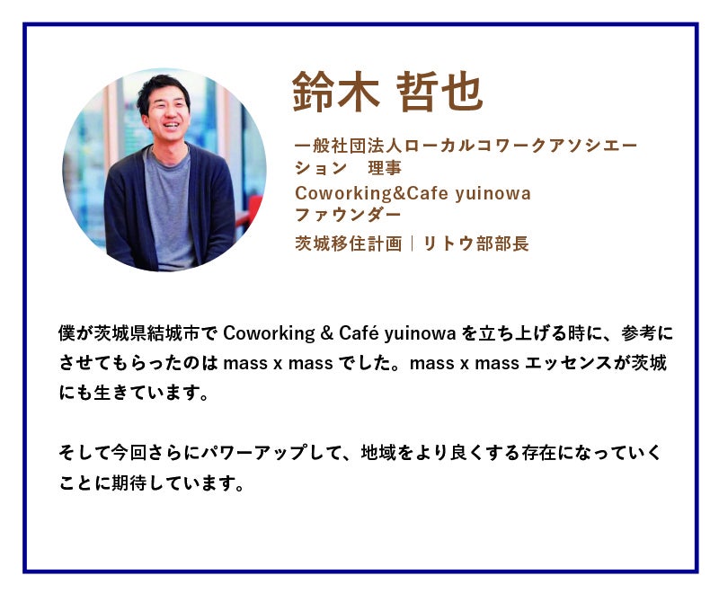 茨城の結城市にあるコワーキングスペース&カフェ yuinowa の鈴木哲也さんから応援メッセージをいただきました!==========鈴木 哲也  一般社団法人ローカルコワークアソシエーション理事 Coworking & Café yuinowaファウンダー/茨城移住計画/リトウ部部長 横浜で色々と活動していた僕にとってmass x massは色々な人との繋がり、何かが生まれる場所としてなくてはならない存在でした。 僕が茨城県結城市でCoworking & Café yuinowaを立ち上げる時に、参考にさせてもらったのはmass x massでした。mass x massエッセンスが茨城にも生きています。 そして今回さらにパワーアップして、地域をより良くする存在になっていくことに期待しています。