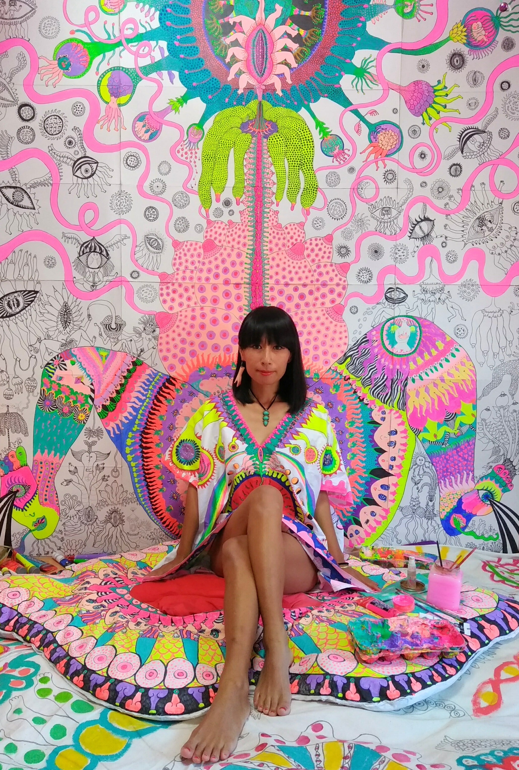 1982年生まれ。岡山県立大学テキスタイルデザインコース卒業。女の野望を『つけま』に表現した「CRAZY つけま」シリーズを始め、『現代アートを着る』をテーマに作るカラフルド派手なコスチューム、身近な生活素材や廃材を材料にした立体造形やインスタレーション、絵画や写真など表現方法はジャンルレスに制作。全作品の軸になっているのは「童心回帰や変身願望、狂喜と笑いと色の爆発!」2018年春からパリと岡山県の芸術交流事業「美咲芸術世界」によりパリのアトリエギャラリー59Rivoli でのパフォーマンスの舞台衣装・ファサードアートを制作。2019年、59Rivoli のアーティストレジデンスに参加。以降、パリと日本を往来しながら活動中。