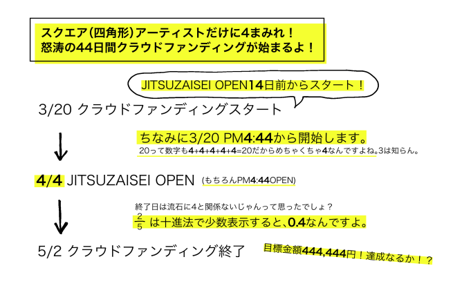 また、Facebookにて非公開グループを作りJITSUZAISEIができるまでの間の応援者を集めました。(現在444人)(444キターーーーーー!)(クラウドファンディング終了まで集め続けます)