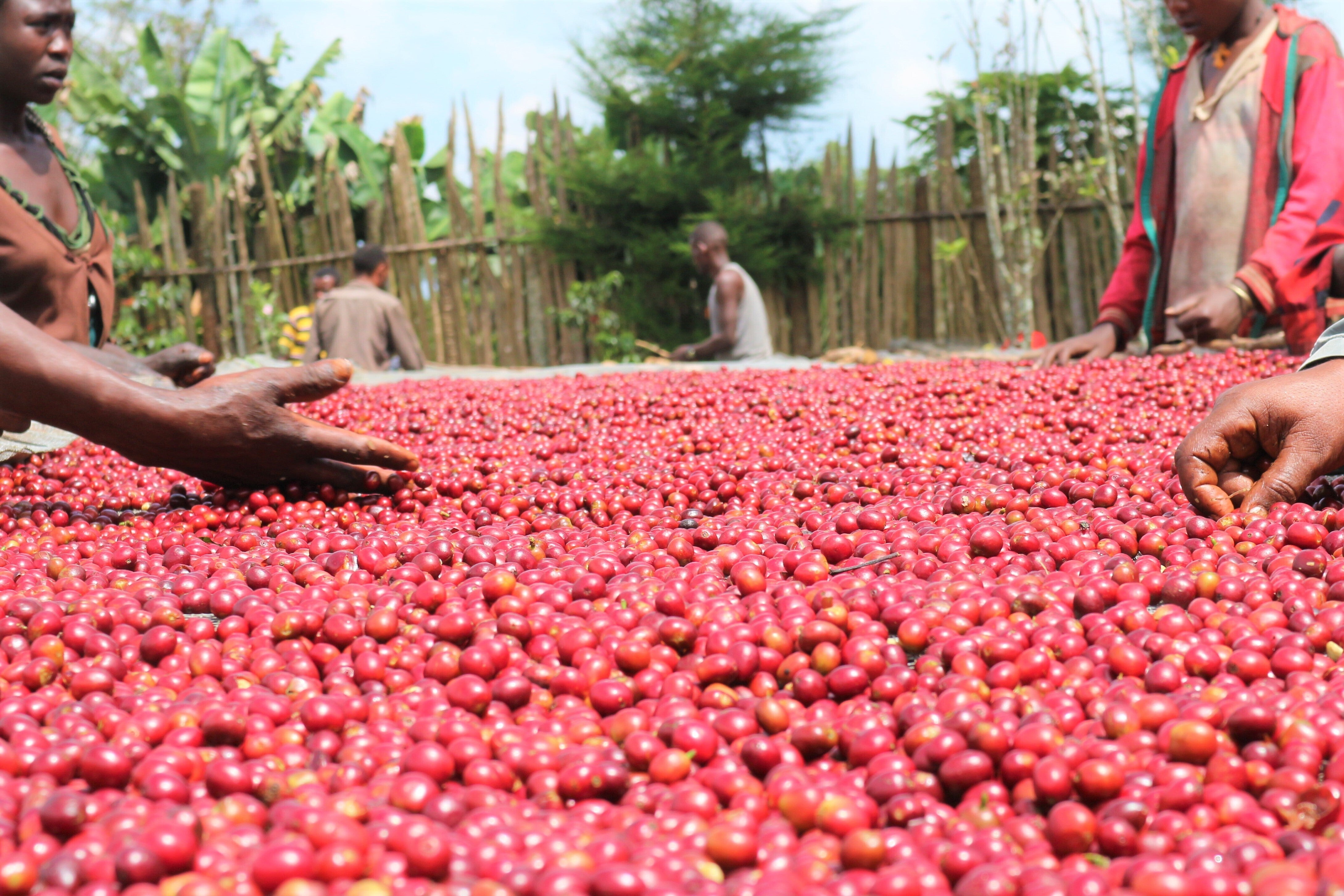 コーヒーの実を天日干ししている様子