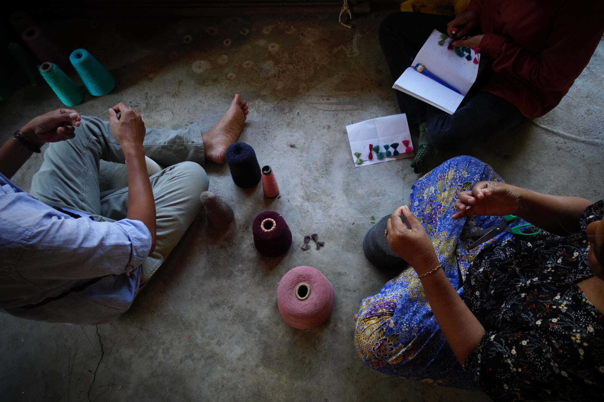 ジャカード織機(フランスで発明された自動織機)と天然染料を使った手染めの技術を持つ女性たちが、美しい家庭用のクッションカバーや小さな絨毯などを作っています。