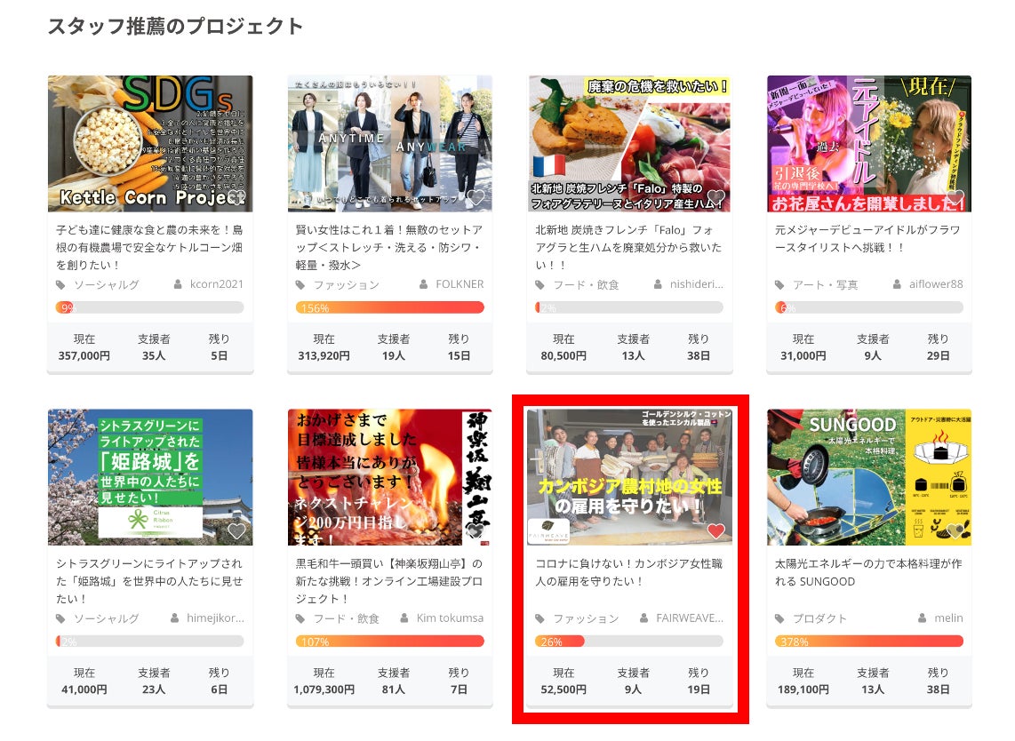 日々のご支援ありがとうございます。FAIRWEAVE Japan staffです。現在、CAMPFIREのスタッフ推薦のプロジェクトにFAIRWEAVEのプロジェクトが掲載されています!!このような形で多くのみなさまにFAIRWEAVEのことを知っていただけるのは非常に嬉しいです。ありがとうございます。FAIRWEAVEが雇用している女性職人は、貧困から小学校も卒業できておらず、読み書きも十分にできない方が大半となります。そのために就職先が見つからず、貧困から抜け出せない負のループに陥ってしまいます。しかし、彼女たちは両親から受け継いだ素晴らしい織物の技術を持っており、FAIRWEAVEはその技術をうまく活用し、彼女たちの雇用創出・継続を行うために彼女たちの製作したシルク・コットン製品をみなさまにお届けする活動を行っています。FAIRWEAVEの製品は、期間限定テナント等で販売させていただくことはありますが、現在日本では店舗等で販売されていないため、CAMPFIREが唯一ご購入いただける場所となっております。ぜひ、この機会にご購入いただけますと幸いです。