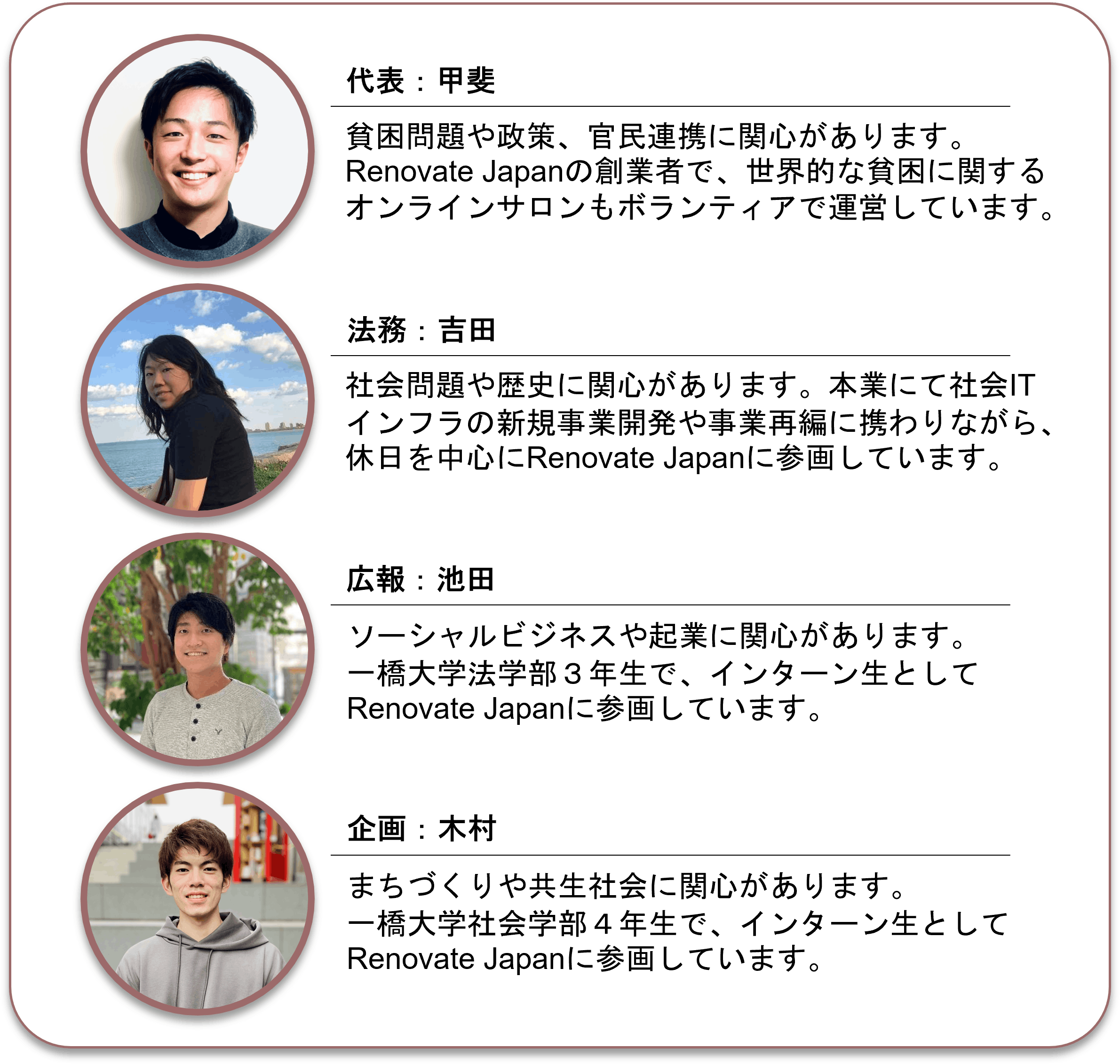 そして、そうした外的な環境や、社会的な構造の欠陥により起きてしまう貧困や生きづらさに強い問題意識を抱き、以降の学生生活ではインドの教育系NGOで活動をしたり、奨学金を得て大学院に進学し貧困に関する研究をしたりなど、取り組んできました。就職してからは公共政策に携わる仕事をしていましたが、その立場では中々アプローチしづらい問題もあると考え、民間側から社会を少しずつ変えていくことに取り組むため、Renovate Japanの起業にいたっています。