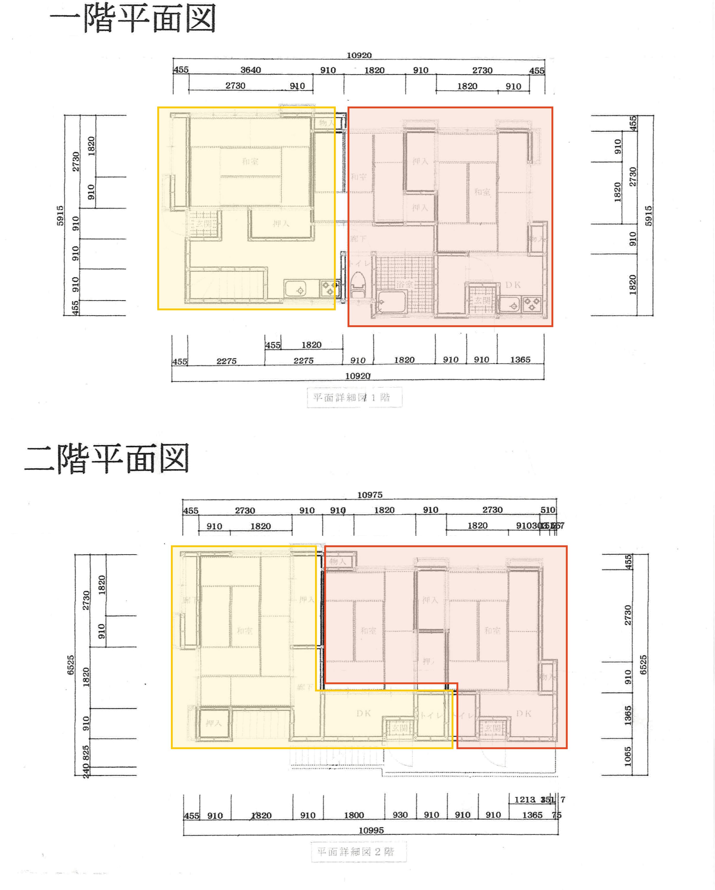 間取り図の黄色の部分をシェアキッチン、残りの赤色の部分をシェルター2室(サイズからしてそれぞれ片親家庭向けと考えている)として運用します。