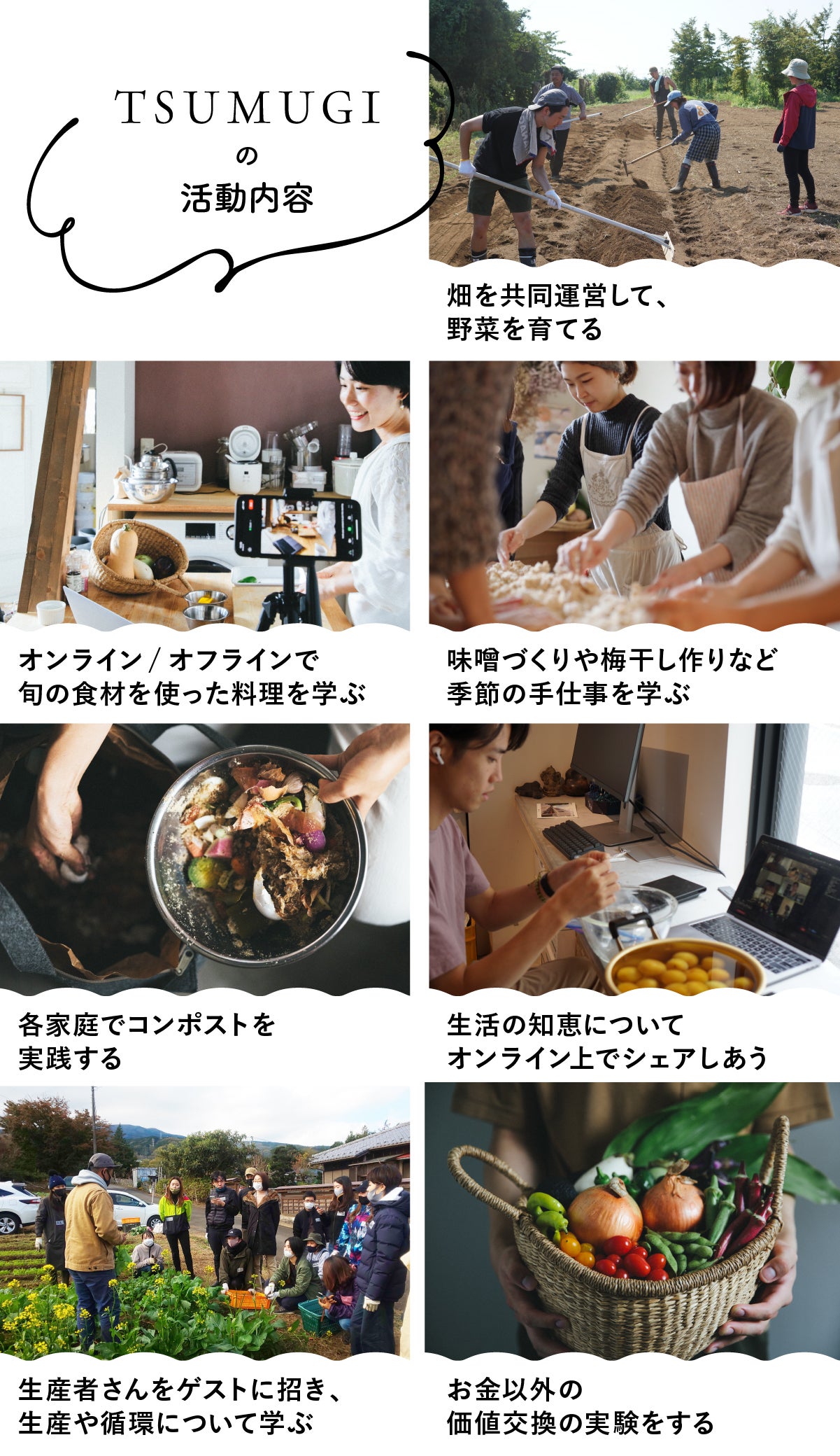 この難しさや葛藤を感じているからこそ、私たちは、TSUMUGIをつくりました。TSUMUGIは、食卓を軸に、自分にも地球にも「善い暮らし」を探求する、生活共同体(コミュニティ)です。衣食住の中でも身近な、「毎日の食卓」にフォーカスして活動をしています