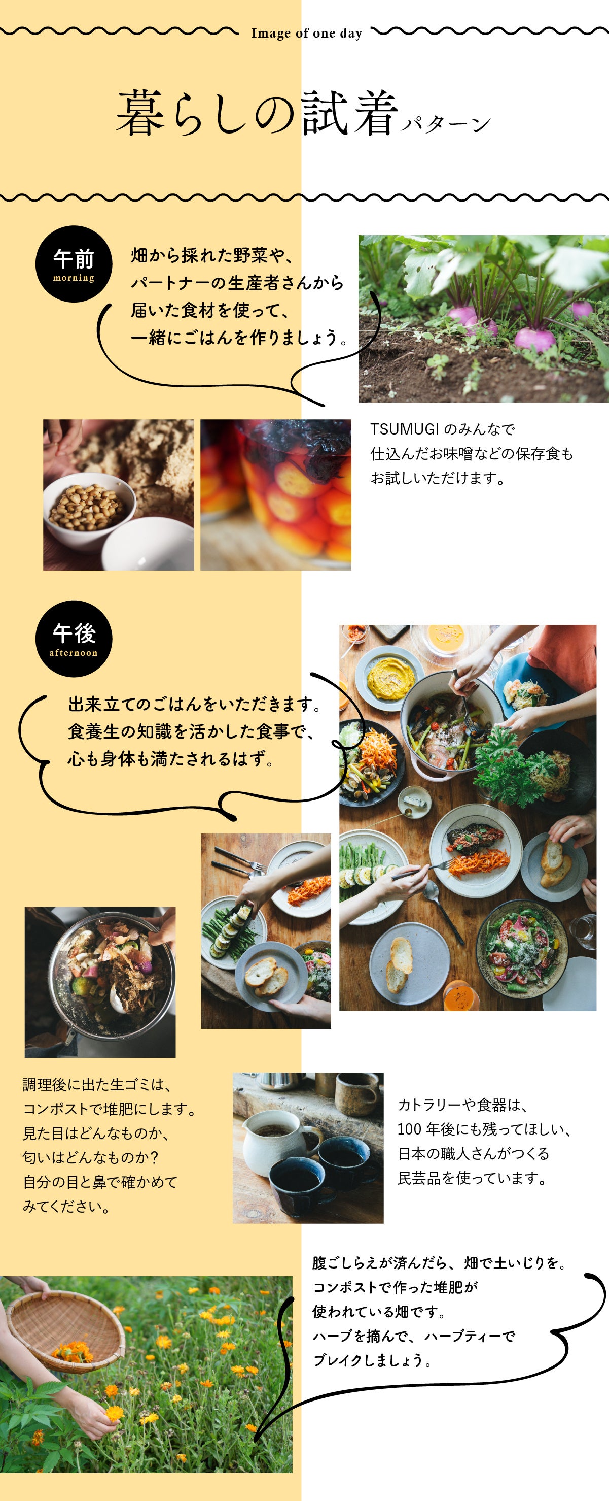 そして、私たちと一緒に、このTSUMUGIという共同体自体を創ること、より継続的に自分の暮らしをより善く変えていくことに興味を持ってくださる方は、ぜひ共同体の仲間になってください。共同体のメンバーは、「食と暮らしの試着室」を共にアイディアを出しながら場作りを行ったり、利用・宿泊も可能です。