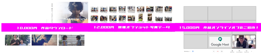 日時を設け、監督やスタッフ、役者が入ったオンラインオフ会に指定された時間にアクセスして頂けき、作品に対するご意見やご感想、アドバイスなどいろいろなお話が聞けたら幸いです。※googol meetにて9月に計5回の開催をおこなう予定です。ご都合の良い日時にご参加ください。