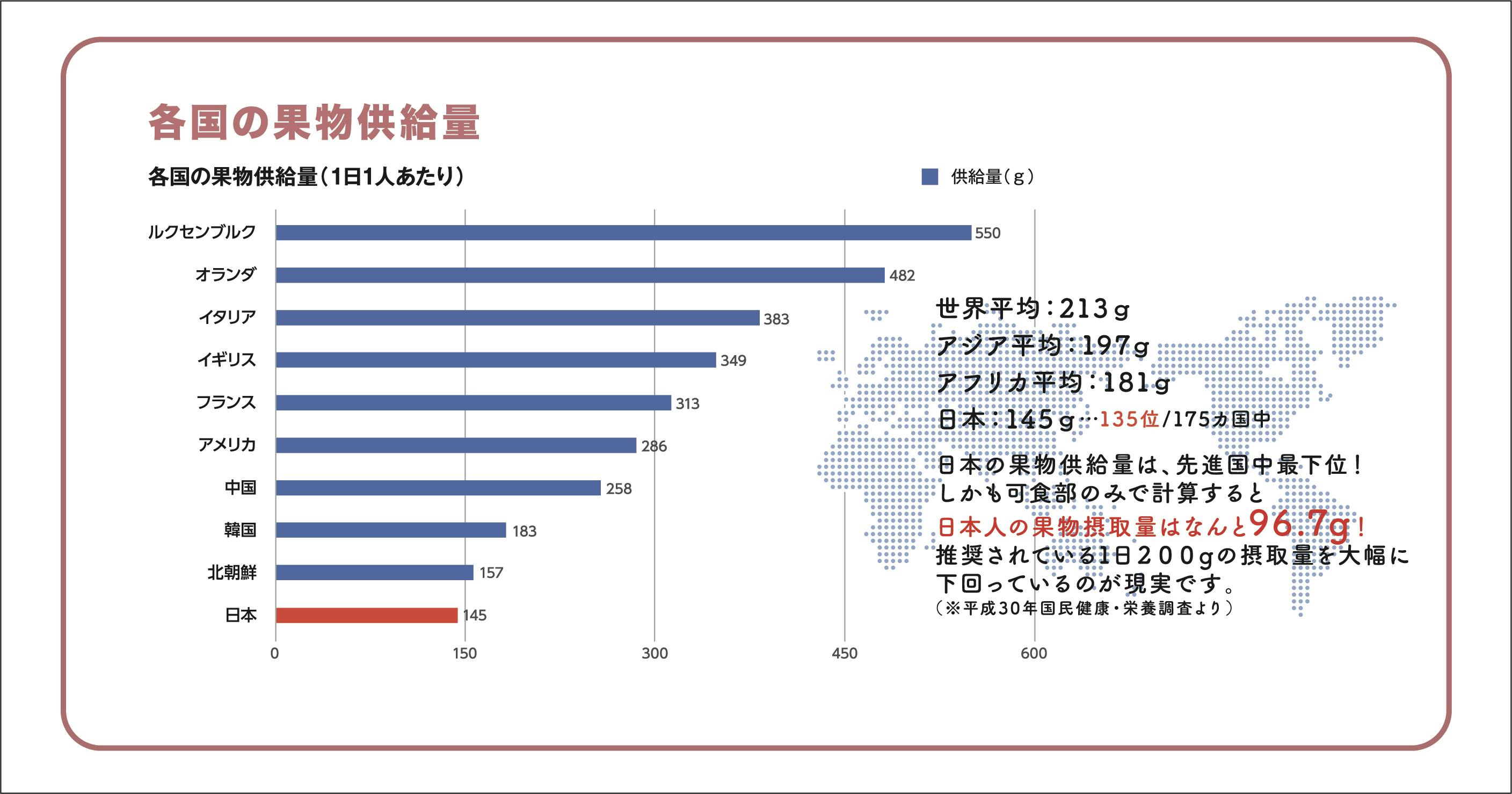 皆さん、フルーツをたくさん食べていますか? 厚生労働省・農林水産省は1人1日200gのフルーツの摂取を目安として推進していますが、実は日本人は現在平均で97gしかフルーツを食べていません。これは残念ながら先進国の中でも最低の水準です。特に若い世代を中心に「価格が高い」、「剥いたり、切ったりが面倒」といった理由からフルーツ離れが進んでしまっているのが現状です。