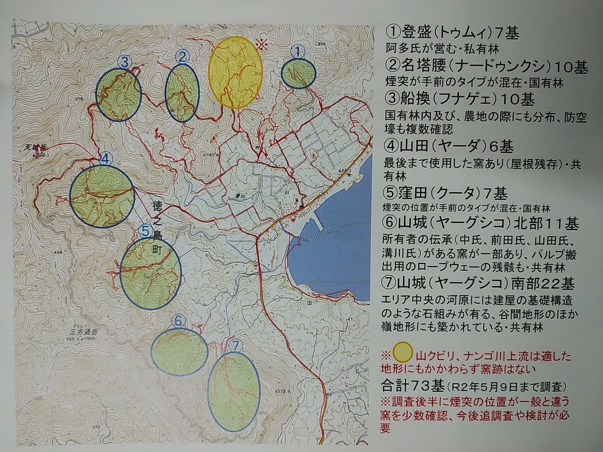 さらに、「他にもあるはずだよ」という先輩方の示唆と、「でもどこにどれだけあるかは誰もわからないよ」という状況から、山集落の山の中を歩き回り、特に沢沿い・谷間に炭窯があることを学習し、(コロナ感染症で聞き書き作業などを控えて)数カ月間とことん山を登り降りしたところ、山集落”だけ”で75基の炭焼き釜を確認しました