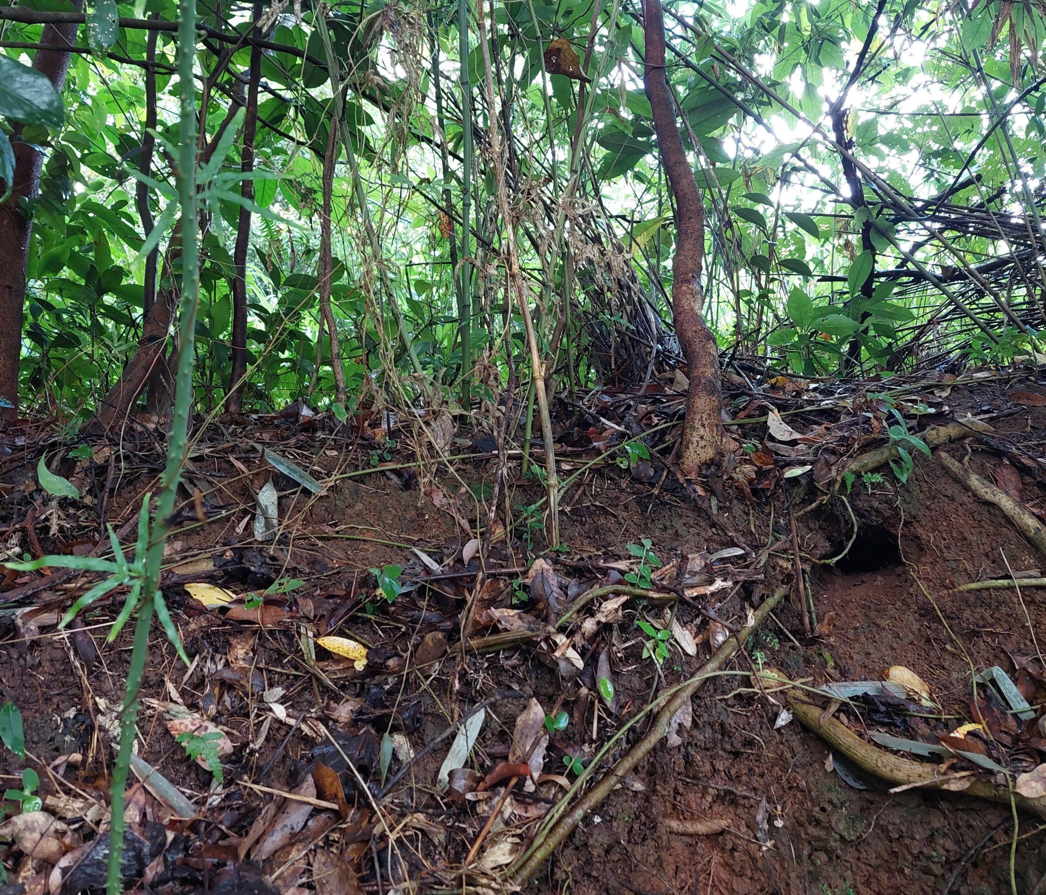 最近、植栽しているスモモの木がかじられたり、草刈りをしたように草丈が揃っていることが多くなっているので、ウサギの活動が活発になっているのが分かっていました。 そして、以前からある巣穴の近くの斜面に、何やら窪みができ土が削られていました。 どうやらウサギが掘ったようですが、岩盤にあたって途中で掘るのを止めた様子、そのような試掘跡が2カ所も。