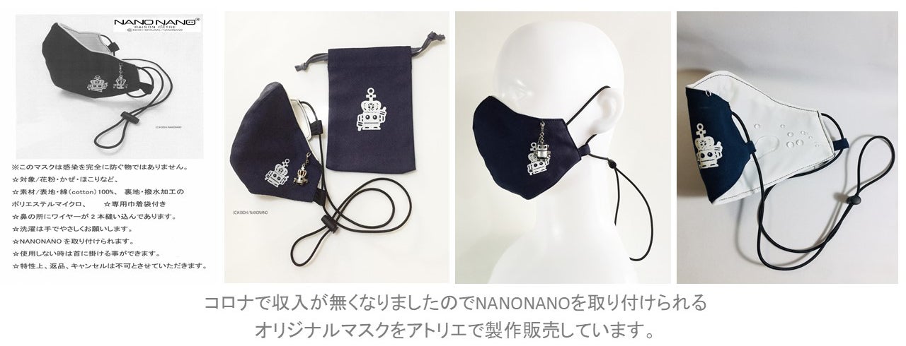2019年夏NANONANOを続けるためバンコクに移住し、2020年1月NANONANOの会社を設立しましたが、2月下旬から新型コロナウィルスのためアートイベントの中止やミュージアムショップの休業などで収入が途絶えました。それで、生活のためNANONANOを取り付けられるマスクをデザインしてアトリエで製作、販売などしながら、NANONANO作品を作っております。