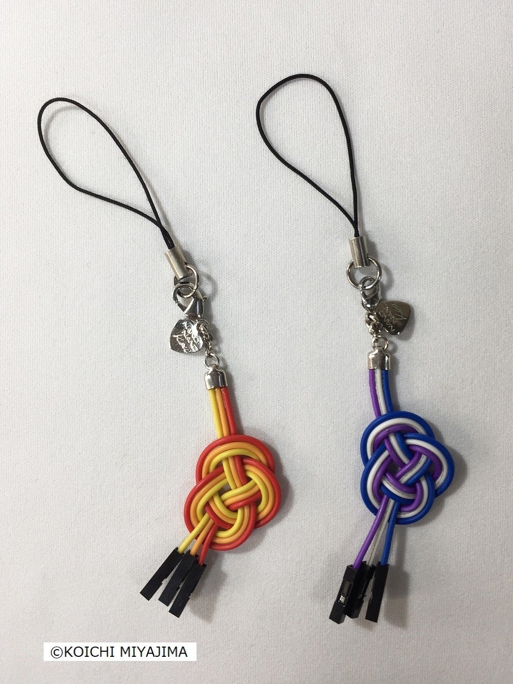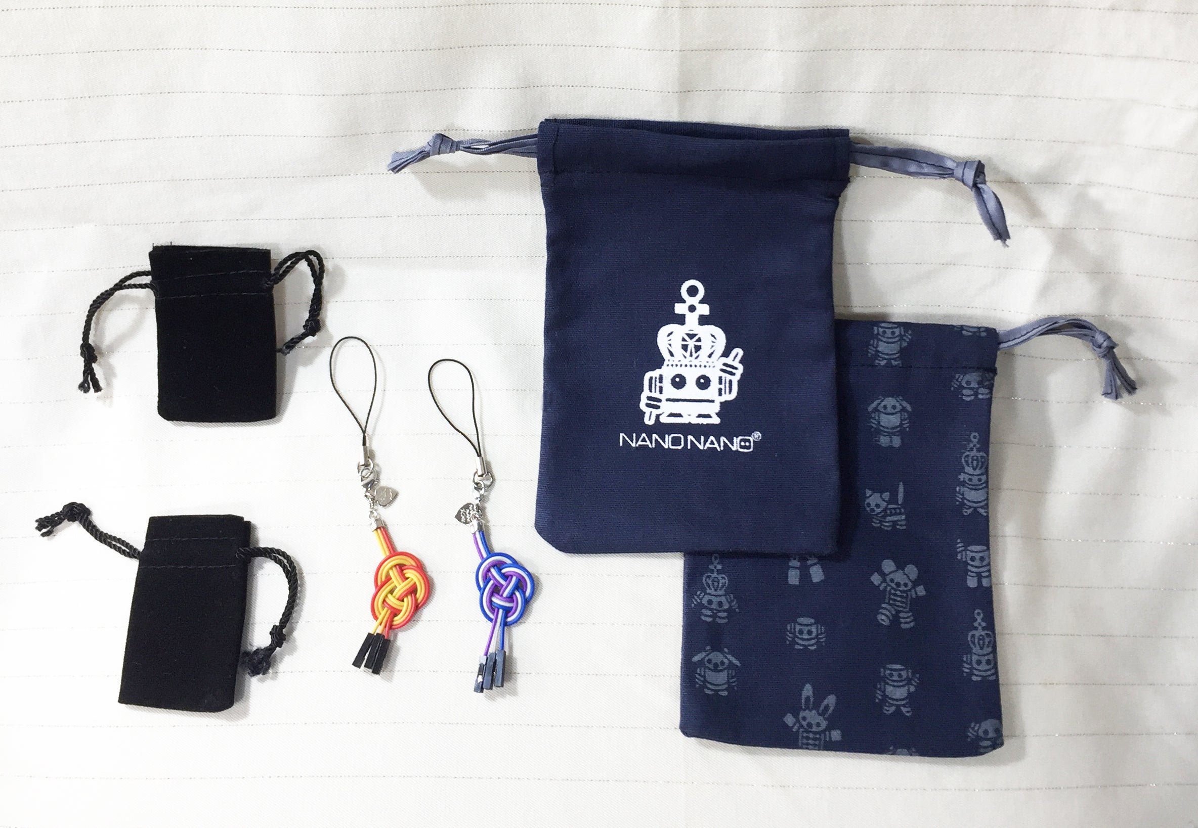 - 水引風電気コードキーホルダー2個、オリジナル巾着袋(コットン100%・横11cm・縦15cm)2個