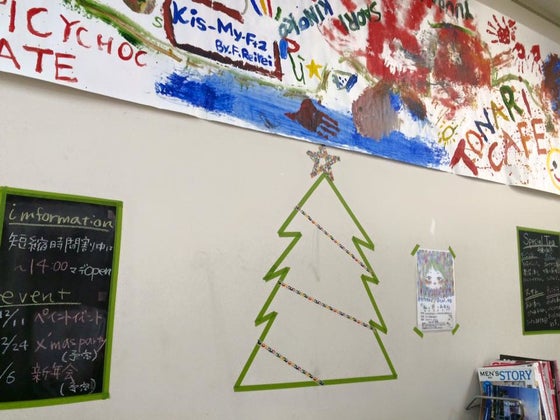 学校は生徒から見て「仕事」的なものであり、それは「セカンドプレイス」ともいえる(ファーストプレイスは家庭)。 現在のニホンには、セカンドプレイスとファーストプレイスしか存在しないといわれ、いずれでもないサードプレイスは高度経済成長とともに消え去ったともいわれている。 そのことが、我々の社会、特に子どもの環境を息苦しくさせている。 かといってカラオケやサークル等は、活動自体が目的的であり、「ただ単に場所があるだけでその活動内容は自由」というサードプレイスとは若干異なる。 それはできれば自然に形成されたほうが望ましいものの、この社会ではほとんどが活動内容が絞られたりそこに金銭が絡んでくる。 自然に生じたサードプレイスはなかなかない。 そこで発想を転換し、セカンドプレイス内にサードプレイスをつくってみることにした。 そうすると生徒たちは気軽に訪れることができるし、転換期にある学校からしても校内に「第三の風」を呼び込むことができる。 まだそのことに自覚的な学校は少ないものの、西成高校(あるいは大阪府立長吉高校や神奈川県立田奈高校ほかは)は徹底的に自覚的である。 だからこそ「となりカフェ」は6年目に突入することができた。 そして、2学期から「モーニングとなりカフェ」という実験に挑戦してみる。★ (officeドーナツトーク代表 田中俊英) ※写真は、となりカフェの壁に貼ったクリスマスツリー(泣かせる)やグループアート、在校生のアート展のお知らせほか