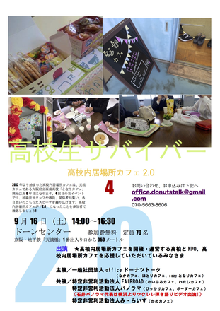 パトロンの方々が5名になりました! 当法人はキャンプファイヤ+グッドモーニングを利用するのは初めてのため、いろいろわからないことも多いのですが、たいへんうれしいです。 また、今日は9/16に開催予定の「高校生サバイバー4」についてもお知らせします。 今年で4回目になる同フォーラムは、高校内居場所カフェを盛り上げるイベントとして毎年秋頃に行ってます。 初回は関西のメディアでも注目され、在阪テレビ局がズラッと取材に来られるなど、たいへん話題になりました。 それだけ高校内に「居場所」をつくる意味が共有されているのだと思います。 みなさま、「高校生サバイバー4」と同時に、その元祖である西成高校「となりカフェ」で2学期よりモーニングサービスを提供する本チャレンジを応援よろしくお願いします。(officeドーナツトーク代表 田中俊英)
