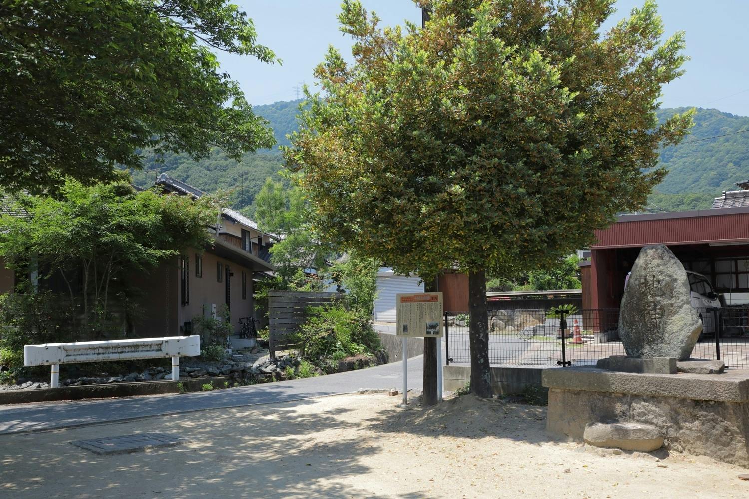3回目の活動歴として、鍛冶屋敷跡には必ず水脈があるはずと専門家からお聞きしたことがあります。「松尾大明神」から歩いて7分、約600メートル西の山手に行ったところに鍛冶屋池という大きなため池があります。そこから、鍛冶屋川という小さな小川が鍛冶屋敷跡沿いに流れています。写真では、ガードレールの手前に水路があります。