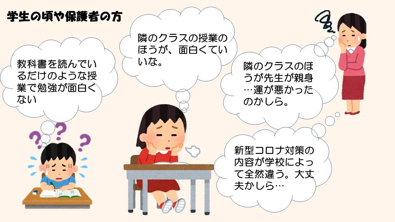 今は新型コロナウィルスが問題となっていますが、閉鎖的であるがゆえに、自分たちの学校で一から考えることが多く、対策の質も内容も学校によってバラバラです。(とある学校の部活で不十分な対策がニュースとなっていました。)