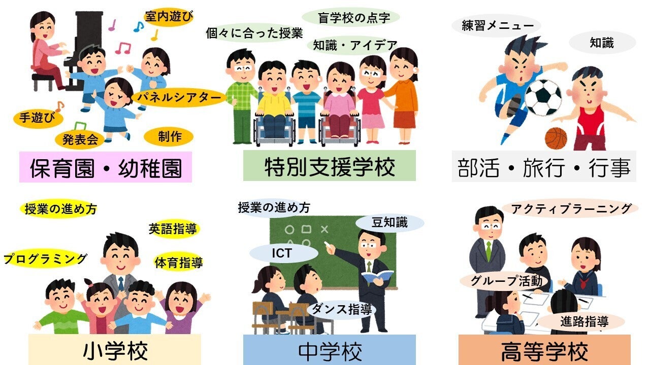 アプリの対象は保育園、幼稚園、小学校、中学校、高校、特別支援学校を考えています。