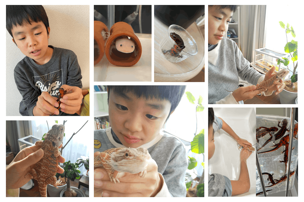 今小学5年生で、4月から6年生になります。僕は、走るのが速いわけでもないし、勉強が得意なわけでもないですが、誰よりも、爬虫類と両生類が大好きです。ちなみに好きな爬虫類、両生類は、コバルトヤドクガエル、イリエワニ、クロイワトカゲモドキ、タイマイ、イクチオステガ、ブラックマンバ…。僕の家では、フトアゴヒゲトカゲ、ウーパールーパー、アカハライモリを飼っています。