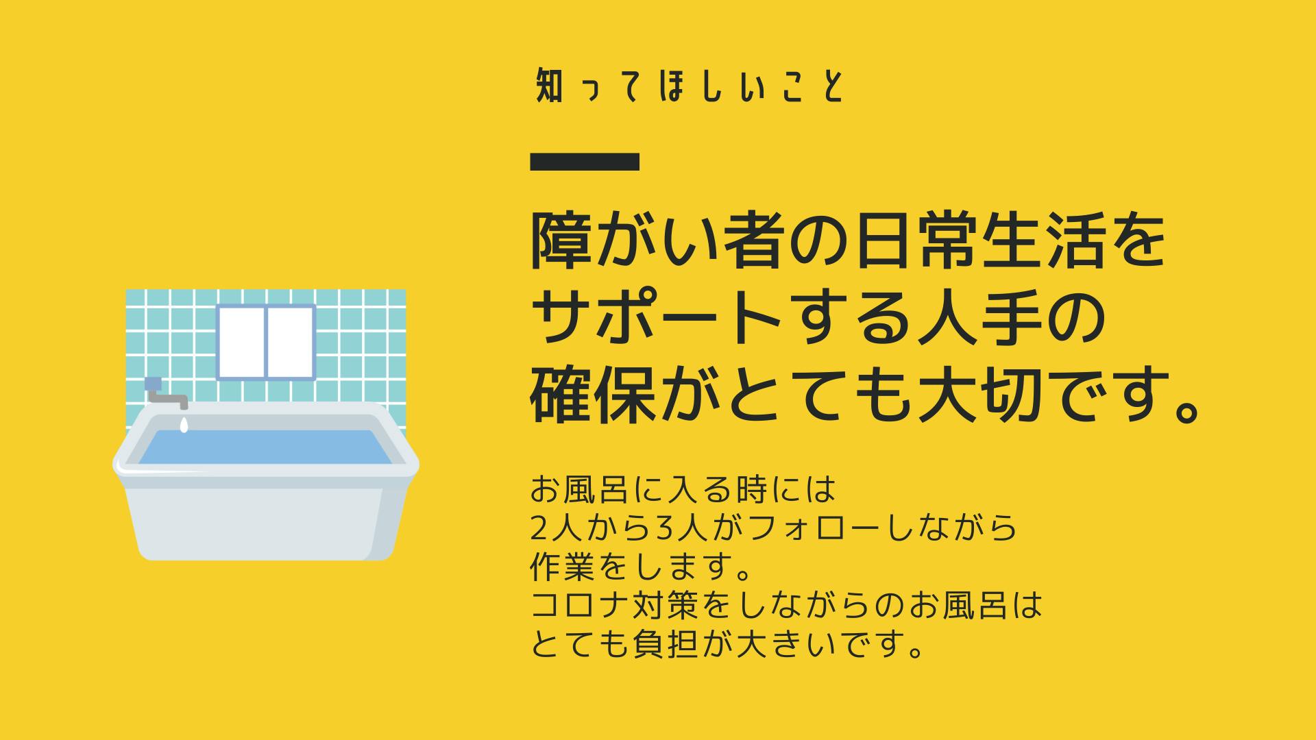 感染対策として施設内の清掃や消毒、健康管理など普段以上の労力がかかるだけでなく、障がいゆえにマスクを正しくつけられない方も多くある中で、日常の生活の中でどうしても接触せざるを得ない入浴や食事介助などお互いに大きな感染リスクが生じています。