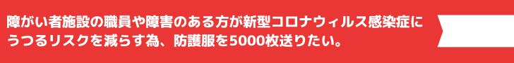 職員や障害のある方々が新型コロナウィルスを互いに感染させないために必要な防護服を5000枚送る事で、障がい者施設に関係するすべての人のいのちを守りたいのです。