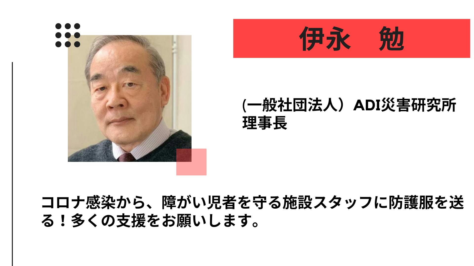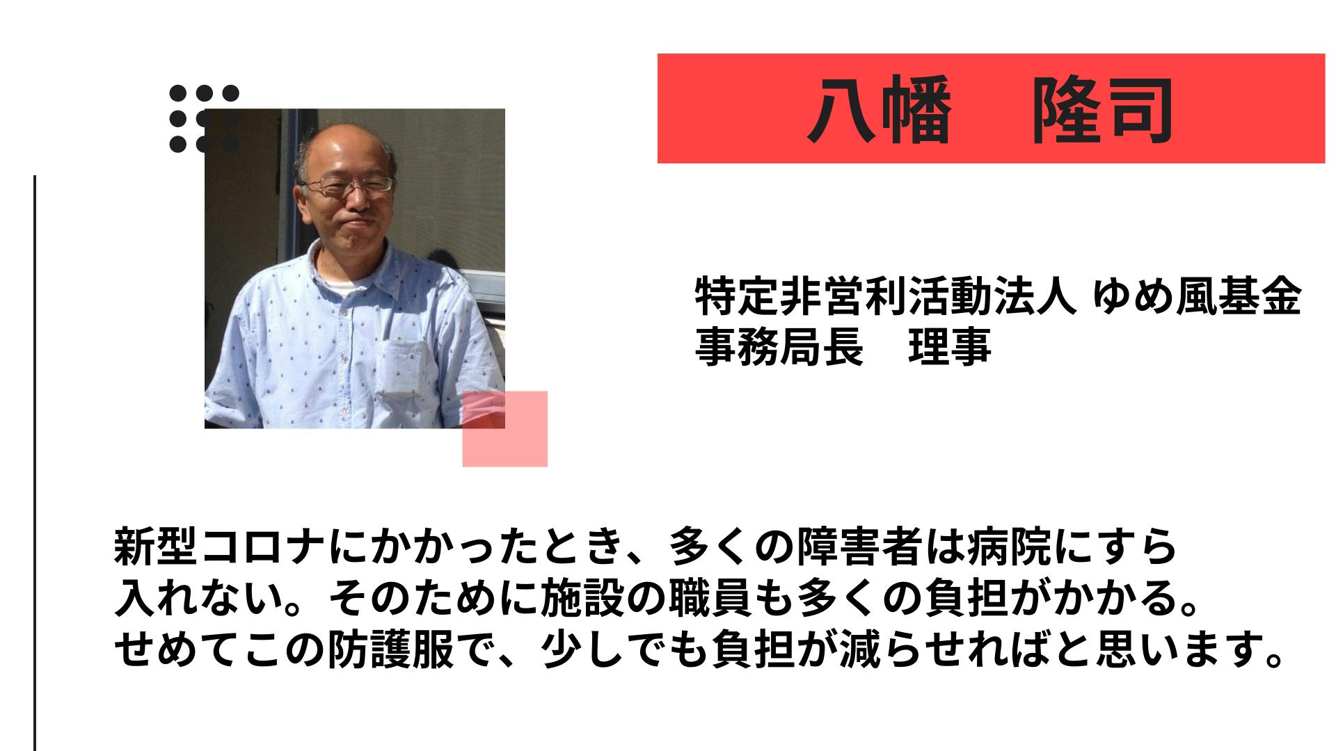 現在、世界中で立ち向かっている新型コロナウィルス感染症は障がい者施設に対してもとても厳しい影響を与えています。このプロジェクトを通して皆さまに新型コロナウィルスと必死に闘っている障がい者施設の現状をお伝えし、感染対策に必要な防護服の支援のお願いをする為にこのプロジェクトを立ち上げました。
