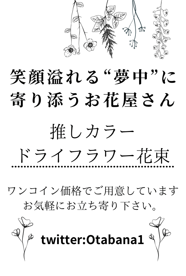 お客様の推しキャラクターのカラーリングをドライフラワーの花束で表現させて頂けたらと考えております!